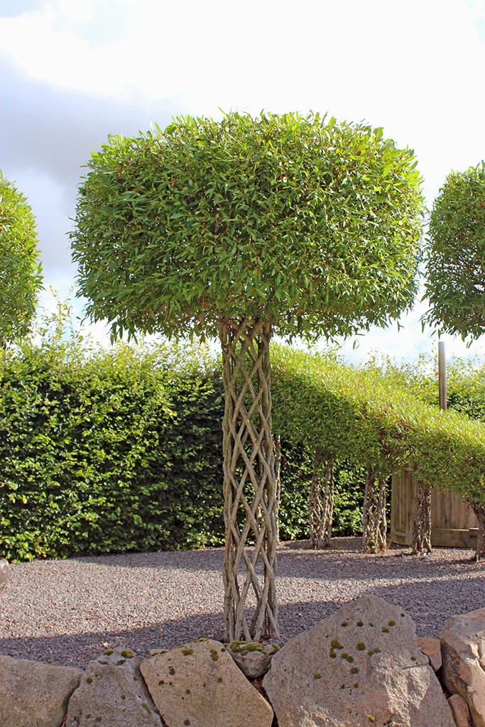 The crown grows quickly and is fully grown first season. By trimming the crown twice during the summer the sculpture will create a lot of branches and the crown will become compact and dense. The willow stems also grow and thicken and they will eventually merge where they cross. The iron stand will secure that the willow sculpture do not change shape but keeps its symmetrical design.